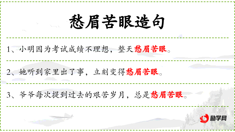 - 愁眉苦眼:形容词短语,形容人忧愁的表情。