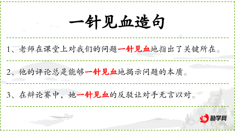 - 一针见血:形容说话或写文章直截了当,切中要害。