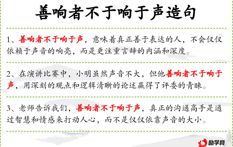 句子:“在公共演讲中,善响者不于响于声的原则提醒我们,要用真诚和智慧去感染听众,而不是仅仅依靠声音的震撼。”