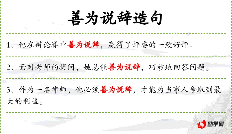 - 善为说辞:善于运用言辞,擅长辩论。