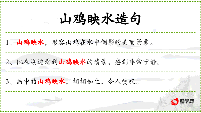 - 主语:山鸡眏水的画面