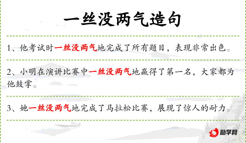 1. 【一丝没两气】 - 指如同一根丝一般十分疲软,上气不接下气。也可形容人呼吸微弱,将要断气的样子。