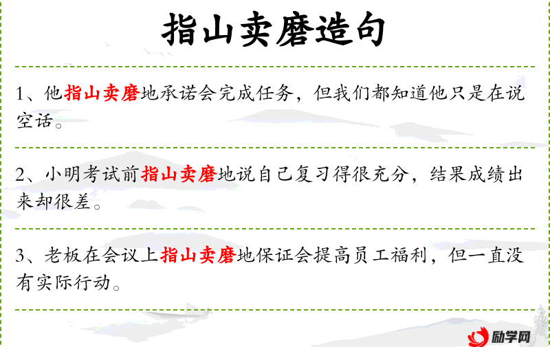 - 成语:指山卖磨,反映了**文化中对诚信和实际行动的重视。