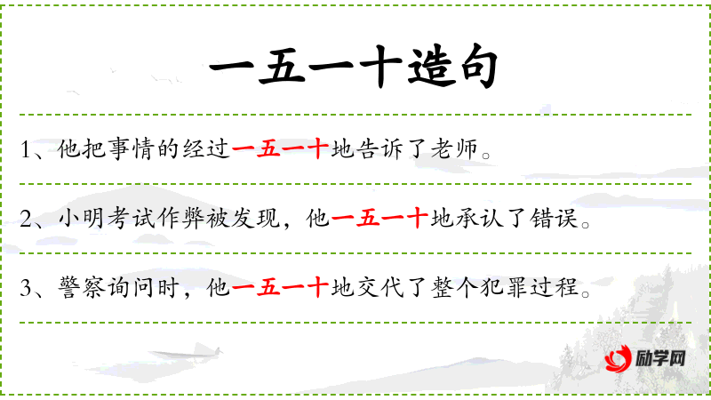 1. 【一五一十】 - 五、十:计数单位。五个十个地将数目点清。比喻叙述从头到尾,源源本本,没有遗漏。也形容查点数目。