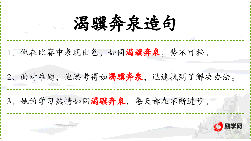 2. 【渴骥奔泉】 - 骥:骏马。如同骏马口渴思饮,飞快奔赴甘泉一般。形容书法笔势矫健。也比喻迫切的欲望。