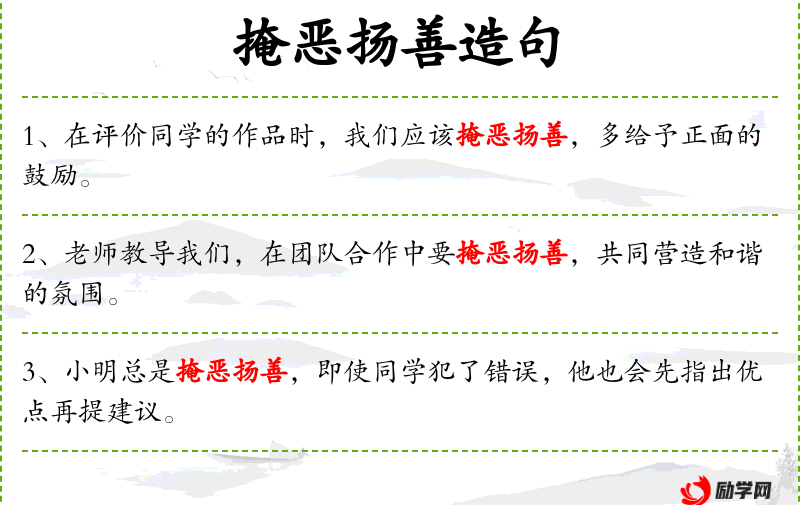 - 掩恶扬善:这一成语体现了**传统文化中强调的正面教育和道德修养。