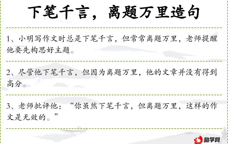 句子:“小明写作文时总是下笔千言,但常常离题万里,老师提醒他要先构思好主题。”