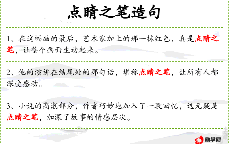 6. 【点睛之笔】 笔:文笔。指文章传神绝妙之处。