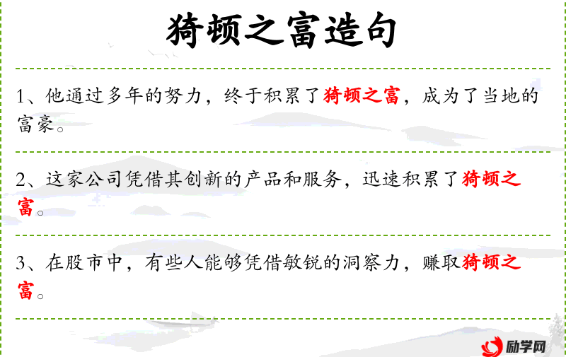 3. 【猗顿之富】 - 猗顿:春秋时鲁国人,家境富裕。像猗顿那样富有。泛指拥有巨额财产。