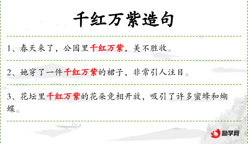 - 千红万紫:形容色彩丰富,多用于形容花朵或物品的颜色多样。