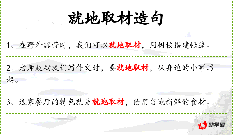 1. 【就地取材】 就:随。在本地找需要的材料。比喻不依靠外力,充分发挥本单位的潜力。