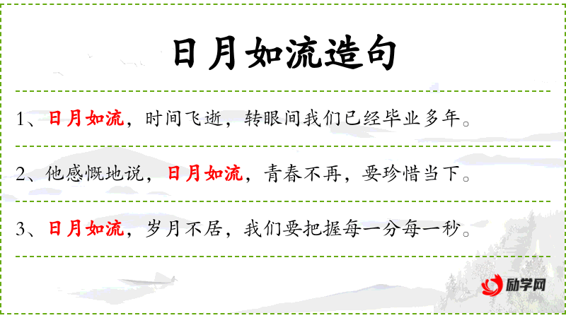 1. 【日月如流】 时光像流水一样迅速消逝。