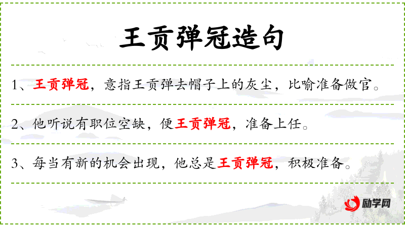 6. 【王贡弹冠】 王:汉代王吉字子阳。贡:即贡禹。弹冠:拂去冠上的尘埃,喻将出来作官。比喻好朋友进退相随,取舍一致。也指一人得官,同类相庆。亦作“王阳在位,贡公弹冠”。