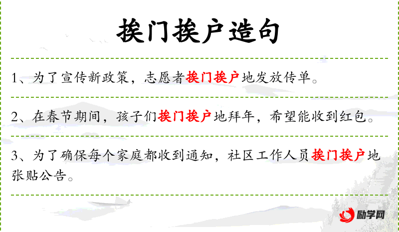 - 挨门挨户:表示逐个访问每一户人家,强调全面性和细致性。
