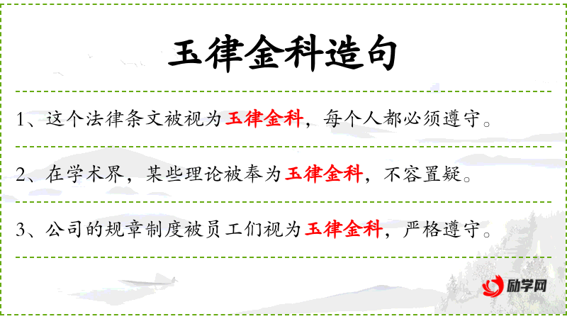 4. 【玉律金科】 - 律:规章,法则;科:旧指法律条文。原形容法令条文的尽善尽美。现比喻必须遵守、不能变更的信条。
