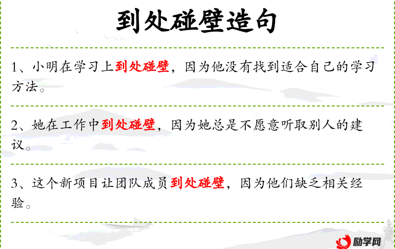 - 到处碰壁:比喻在尝试解决问题时遇到很多困难或障碍。
