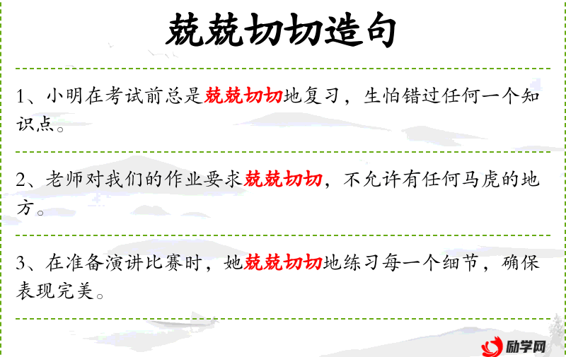- 兢兢切切:形容词,形容非常认真、细致,不容许有任何疏忽。