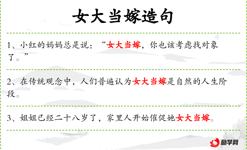 句子:“在老一辈的观念里,女大当嫁几乎是每个女孩必经的人生大事。”
