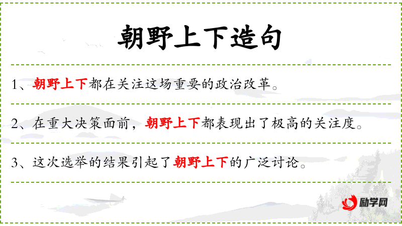 2. 【朝野上下】 朝野:指朝廷和民间;上下:从中央到地方。指从中央到地方,从做官的到老百姓。