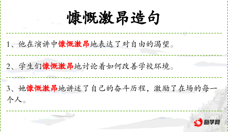 - 慷慨激昂:形容词,形容说话或行动时情绪激动,充满热情。