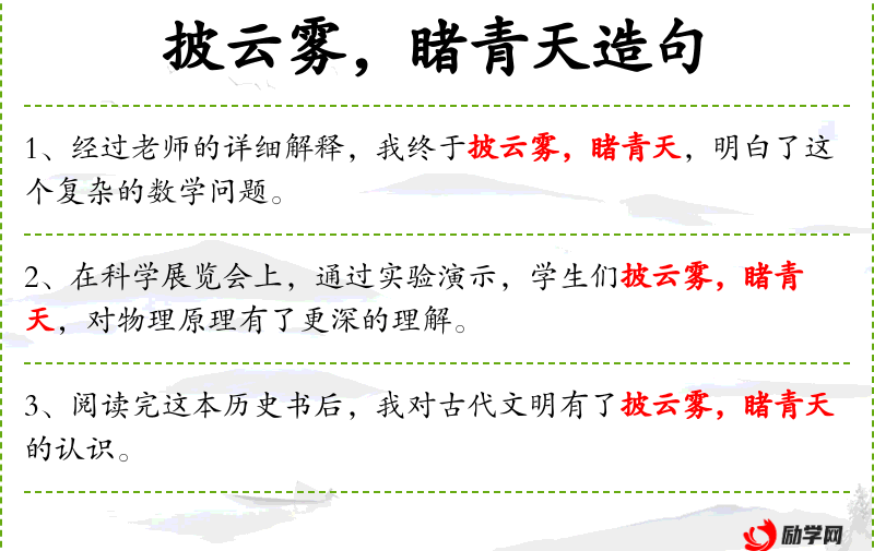 “披云雾,睹青天”这个表达源自**古典文学,常用来形容从困惑到明悟的过程。这里体现了中文中丰富的比喻和象征手法。