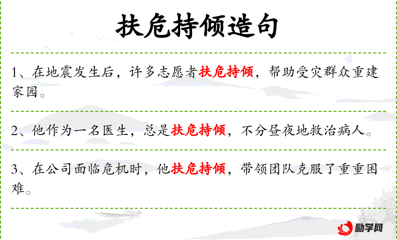 - 扶危持倾:成语,意为在危难时刻给予帮助和支持。