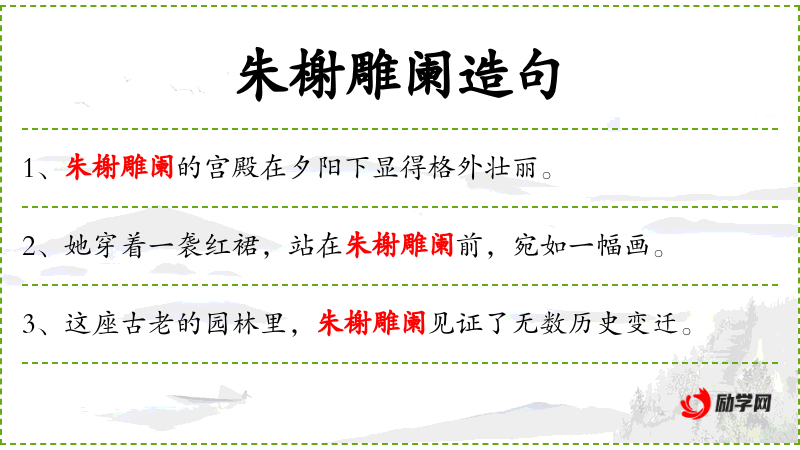 1. 【朱榭雕阑】 - 朱:红色。形容楼阁漆红饰绿,建筑豪华富丽