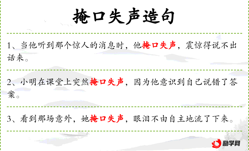 - 掩口失声:表示因惊讶或激动而用手遮住嘴巴,同时声音中断。
