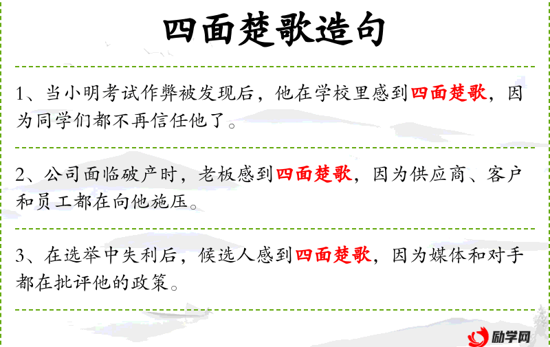 - 文化意义:“四面楚歌”源自**古代历史,比喻孤立无援的境地。