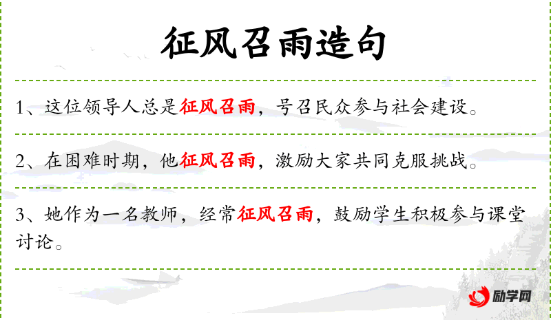 “征风召雨”是一个**成语,源自古代神话故事,比喻号召或动员大家。在这里,它被用来形象地描述教师激发学生积极性的行为。