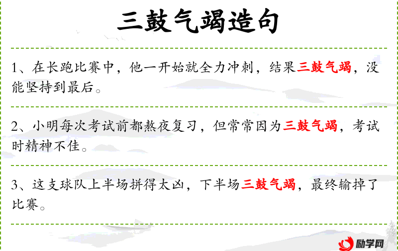 - 三鼓气竭:比喻力气用尽,源自古代战鼓声,三鼓后士兵力气耗尽。