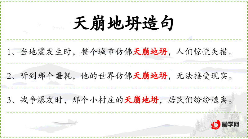 - 天崩地坍:a metaphorical expression meaning the sky is falling and the earth is cracking, used to describe extreme shock or devastation.