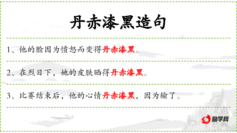 - 丹赤漆黑:形容颜色,丹赤指红色,漆黑指黑色,这里形容脸色由红转黑。
