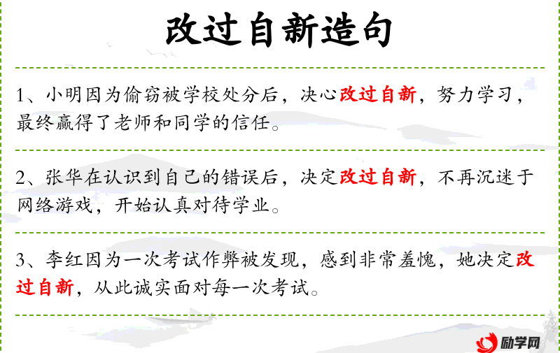 - 相关成语:“改过自新”是一个常用的成语,意味着彻底改变过去的错误行为。