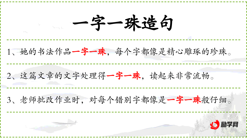 一个字就象一颗珍珠。形容歌声婉转圆润。也比喻文章优美,辞藻华丽。