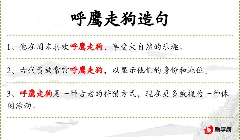 - 呼鹰走狗:这个词组描述的是一种狩猎活动,其中“呼鹰”指的是用鹰进行狩猎,“走狗”指的是用狗进行狩猎。