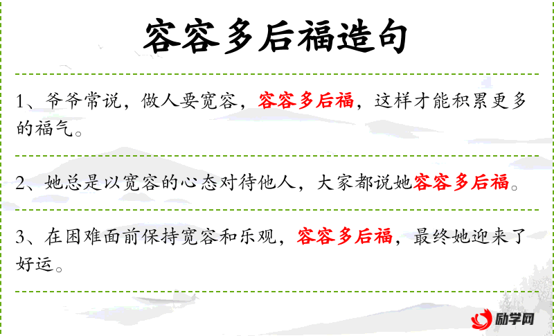 句子:“在家庭中,宽容是维系和谐的关键,容容多后福,家庭也会更加幸福。”