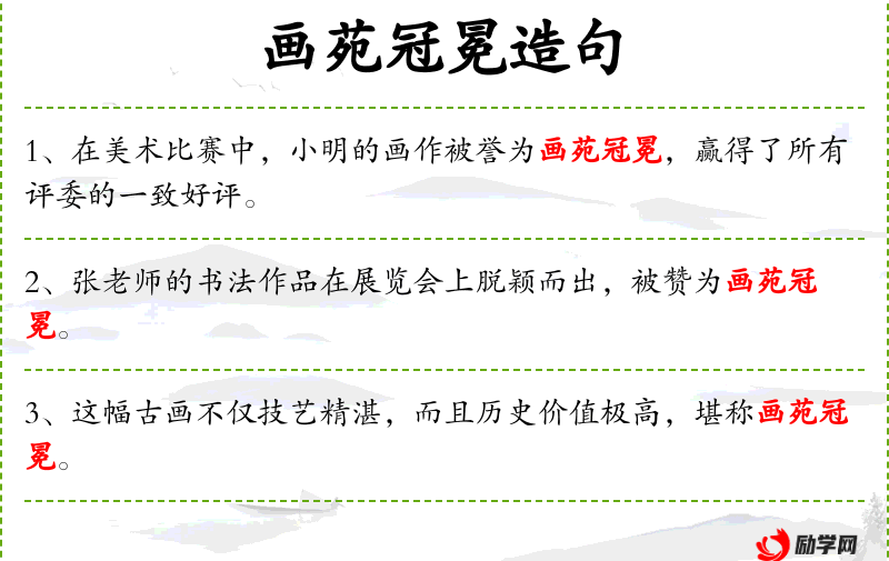 7. 【画苑冠冕】 苑:会聚的地方,多指学术、艺术的集中处;冠冕:皇冠帝冕,比喻第一。在美术界占据第一流的地位。