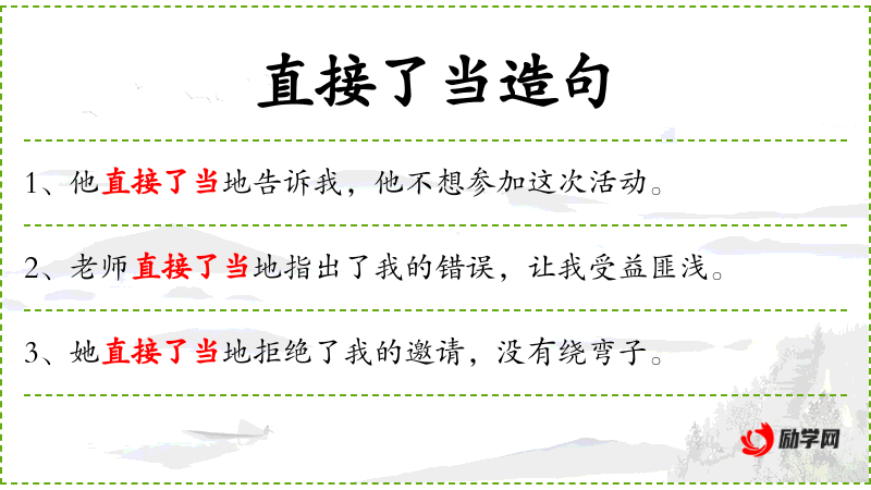 2. 【直接了当】 - 了当:干脆,爽快。形容说话做事爽快、不绕弯子