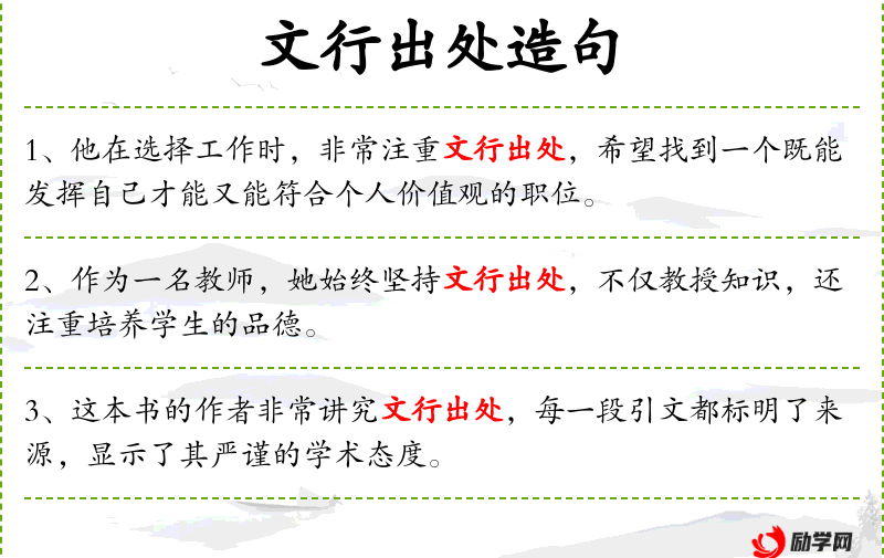- 文行出处:这个词组在**文化中较为常见,强调了工作的正当性和来源的重要性。