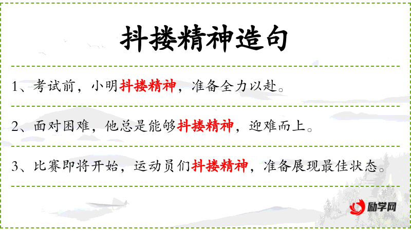 - 抖搂精神:动词短语,表示振作精神