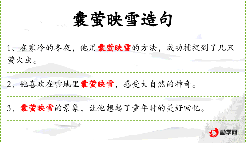 - 囊萤映雪:这是一个成语,比喻在艰苦条件下坚持学*或工作。