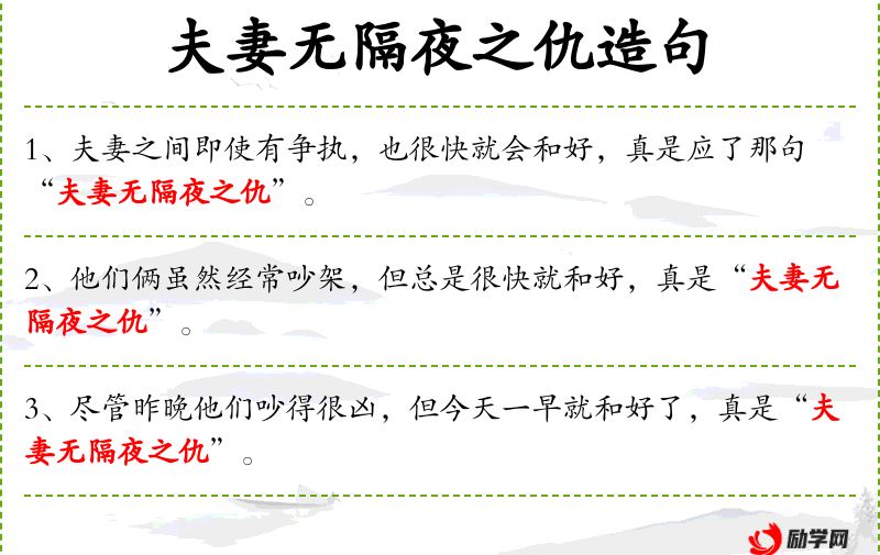 - 夫妻无隔夜之仇:成语,意思是夫妻之间的争执不会持续到第二天,比喻矛盾很快就会解决。