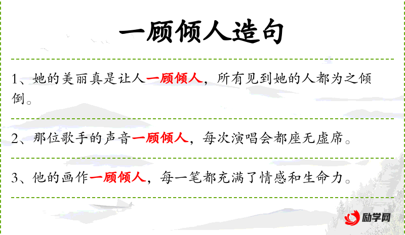 1. 【一顾倾人】 - 形容女子容貌艳丽。