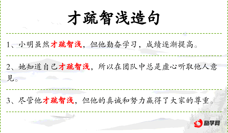 - 由于知道自己才疏智浅,她在团队中总是表现出虚心的态度,积极采纳他人的意见。