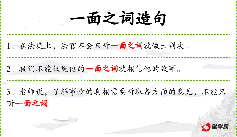 1. 【一面之词】 - 争执的双方中一方所说的话。