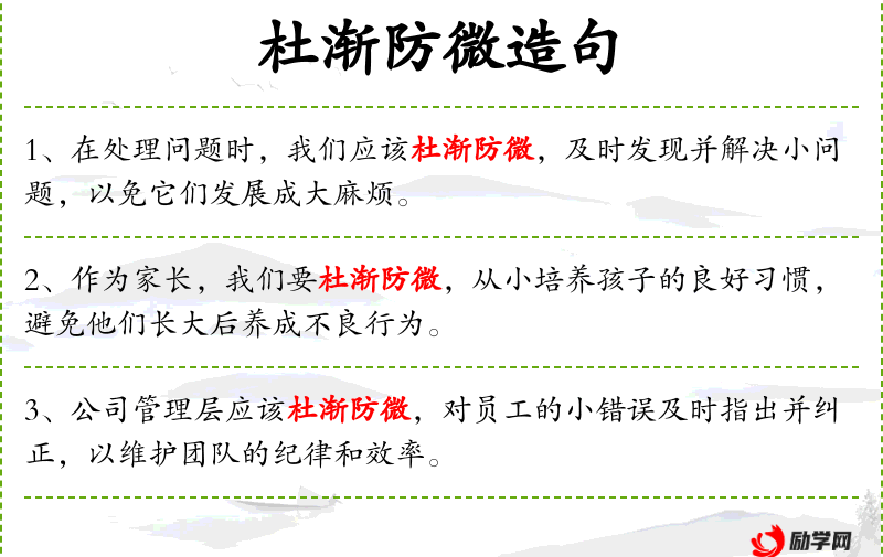 7. 【杜渐防微】 杜:堵住;渐:指事物的开端;微:微小。错误或坏事刚冒头就及时制止,不让它发展。