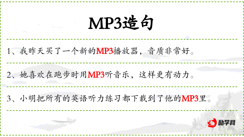 1. 【MP3】 - 一种常用的数字音颜压缩格式,也指采用这种格式的音频文件及播放这种格式音频文件的袖珍型电子产品。
