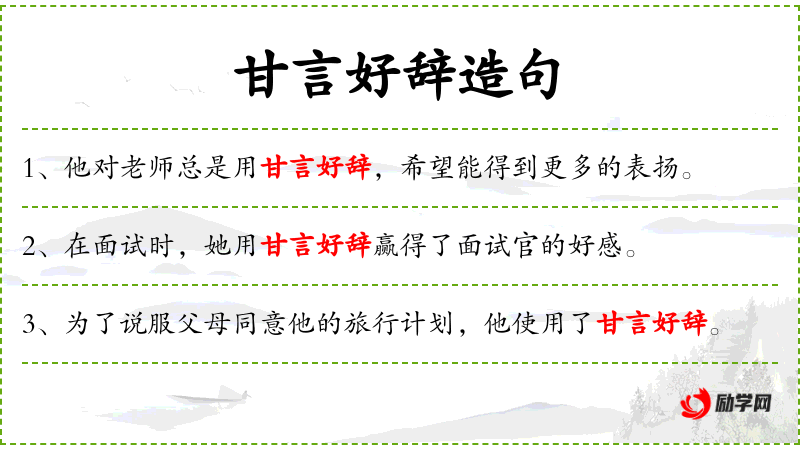 甘言:甜美动听的语言;好辞:逢迎讨好的言辞。甜美动听的逢迎之辞。