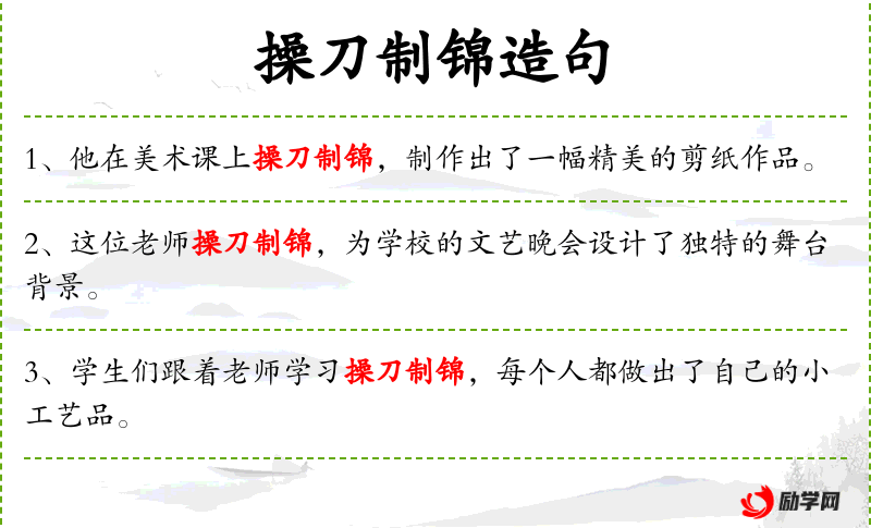 - 操刀制锦:原意是指亲自操作制作精美的织物,这里比喻孩子们亲自制作精美的装饰品。
